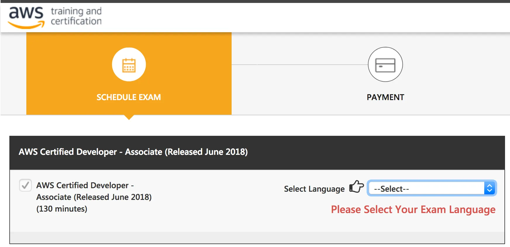 AWS 교육 및 등록 사이트 자격증 메뉴에서 회원가입 후 로그인을 하여 시험을 신청할 수 있다. SAA 2018년 2월 개정 시험에는 영어, 일본어만 지원하고 있다